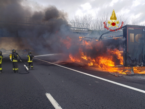 CASERTA. Dalle ore 14:00 di ieri pomeriggio fino alle ore 03:00 di questa notte, una squadra dei Vigili del Fuoco del Comando provinciale di Caserta, proveniente dal distaccamento di Teano, è intervenuta sull’autostrada A1, tra i caselli di Caianello e Capua, al km 718+400, per un incendio che ha interessato un autoarticolato. Il conducente del mezzo, accortosi delle prime avvisaglie di fumo, ha prontamente arrestato la marcia fermandosi in una piazzola di sosta. All’arrivo dei Vigili del Fuoco l’autoarticolato, che trasportava assi di legno, risultava completamente avvolto dalle fiamme, con una densa colonna di fumo visibile anche a distanza e notevoli disagi alla circolazione. L’autostrada è rimasta infatti chiusa per diverse ore per consentire le operazioni di spegnimento e messa in sicurezza dell’area. In supporto alla squadra intervenuta sono giunte anche cinque autobotti: tre dal Comando provinciale di Caserta e due dal Comando di Napoli. Per domare completamente l’incendio è stato necessario anche l’utilizzo di schiuma antincendio. Le operazioni di spegnimento e bonifica si sono concluse intorno alle ore 03:00. Fortunatamente non si registrano feriti.